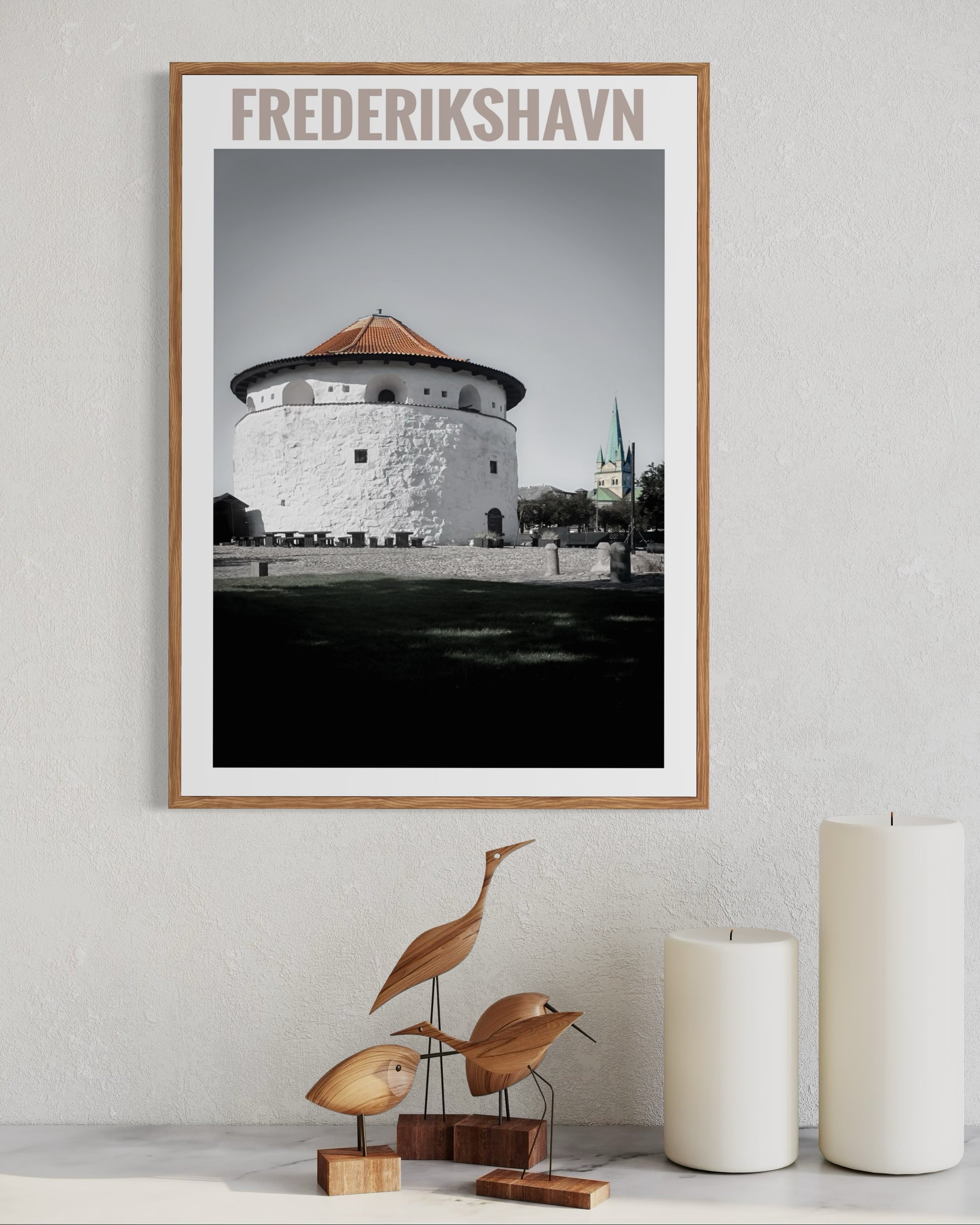 Fang stemningen fra Frederikshavn med denne elegante byplakat, hvor byens historiske Krudttårn står stolt i forgrunden, flankeret af den smukke Frederikshavn Kirke i baggrunden.