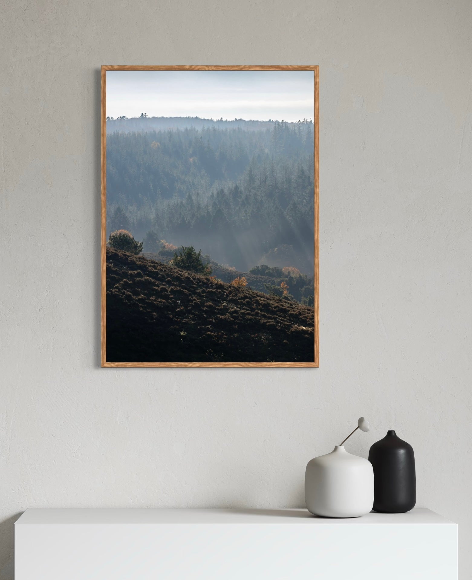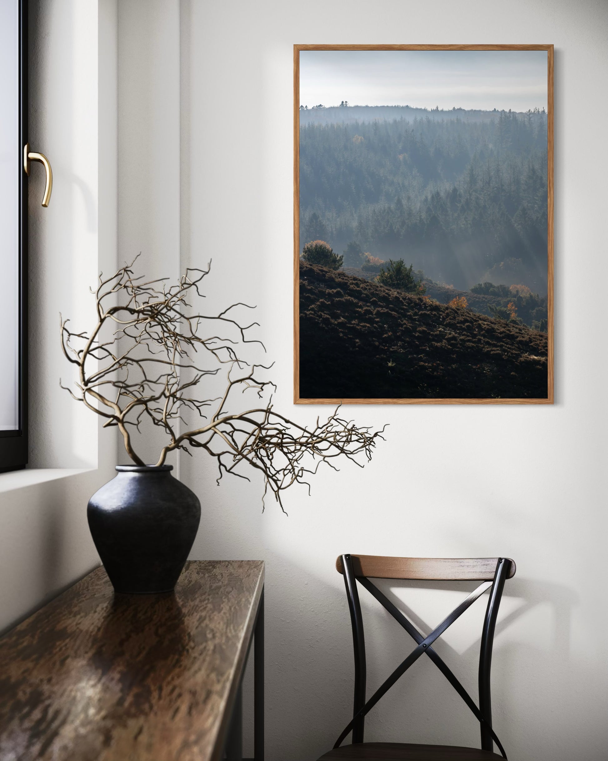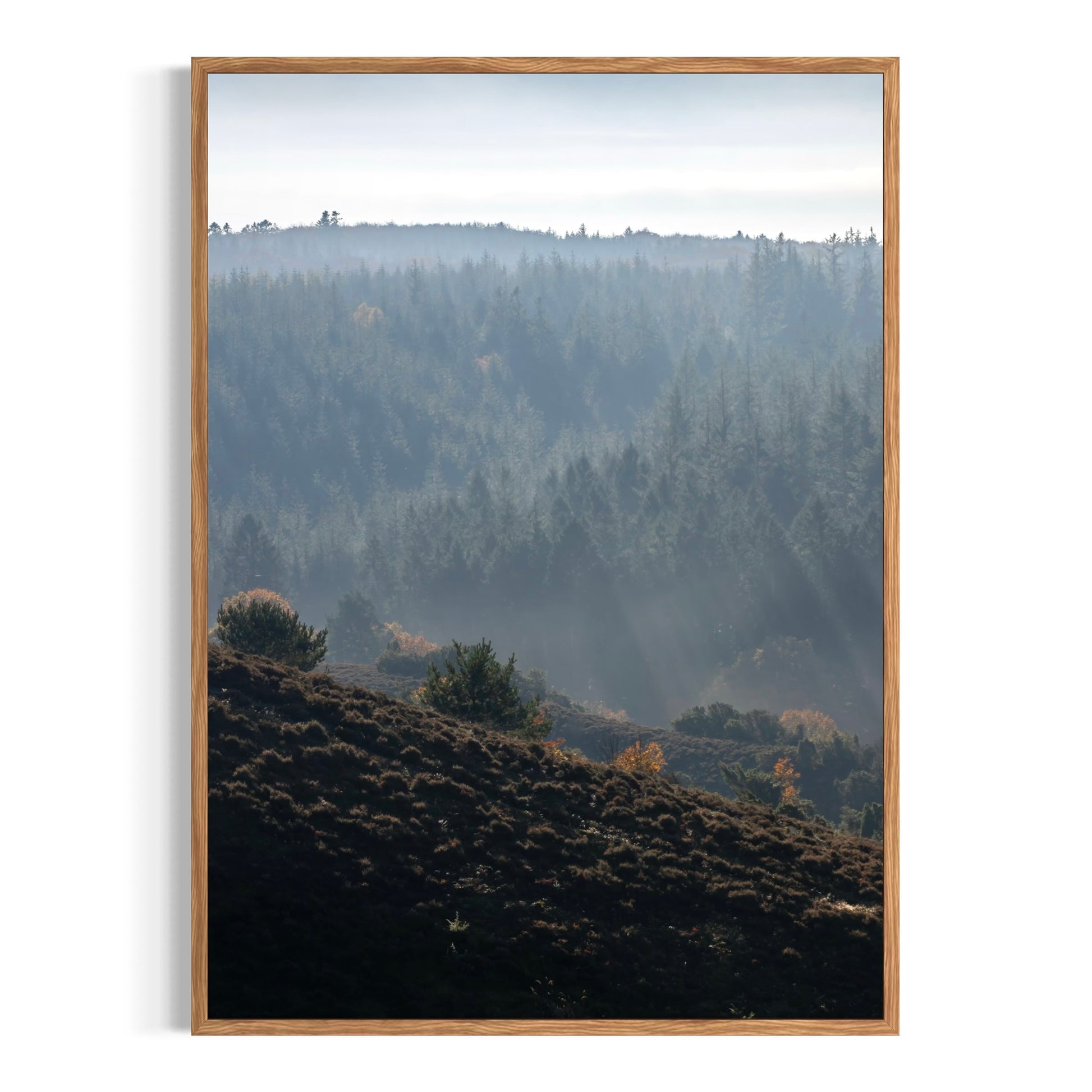 Oplev den magiske stemning fra Rebild Bakker, hvor solen bryder gennem disen og kaster bløde stråler igennem træerne og det smukke bakkede landskab.