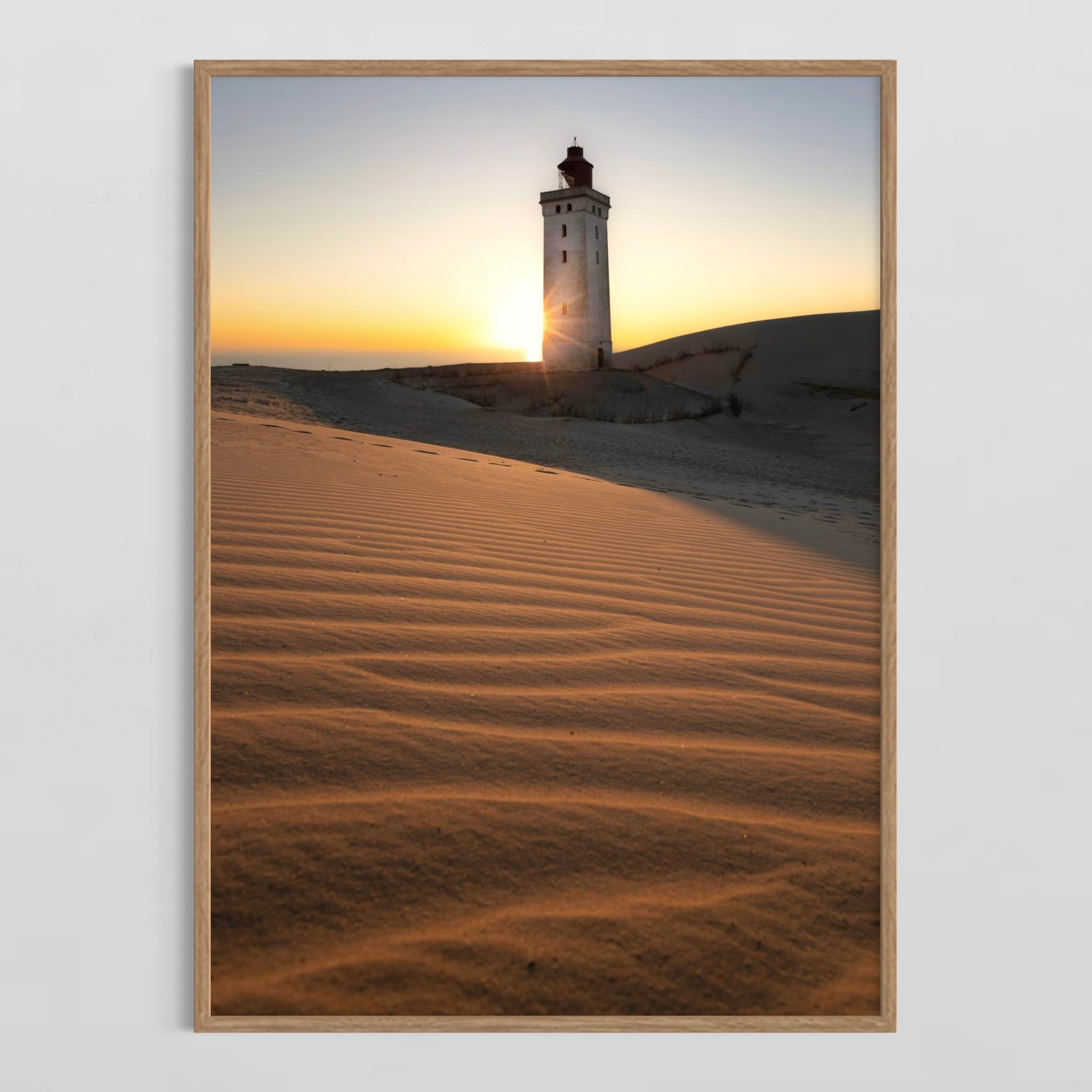 Fanget i det gyldne aftenlys står det ikoniske Råbjerg Knude Fyr ensomt og stolt midt i sandklitterne. En plakat, der indfanger både stilheden, lyset og det rå nordjyske landskab på smukkeste vis.